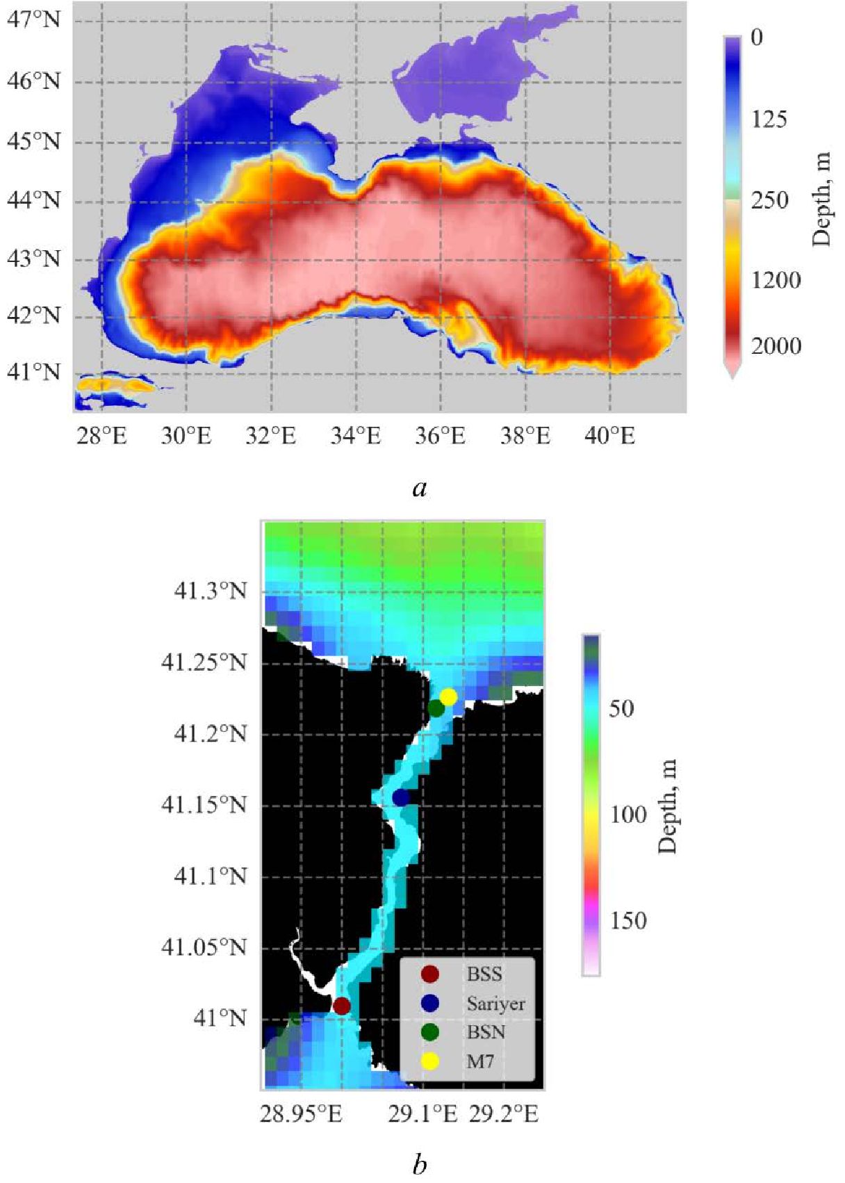 Fig. 1. Bottom topography for the NEMO regional configuration: for the entire numerical domain (a) and the strait water area (b). Configuration of the strait coasts is given according to the data from https://www.openstreetmap.org/; dots on fragment b indicate the station positions by analogy with [2]: BSS – Bosphorus Strait South, Sariyer – Cape Sarrier, BSN – Bosphorus Strait North; station M7 is taken from [6]