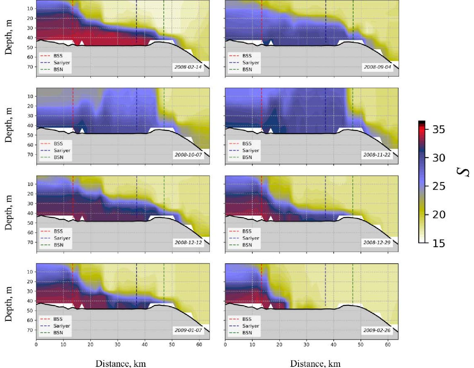 Fig. 3. Distribution of seawater salinity along the Bosphorus Strait on certain dates in 2008–2009