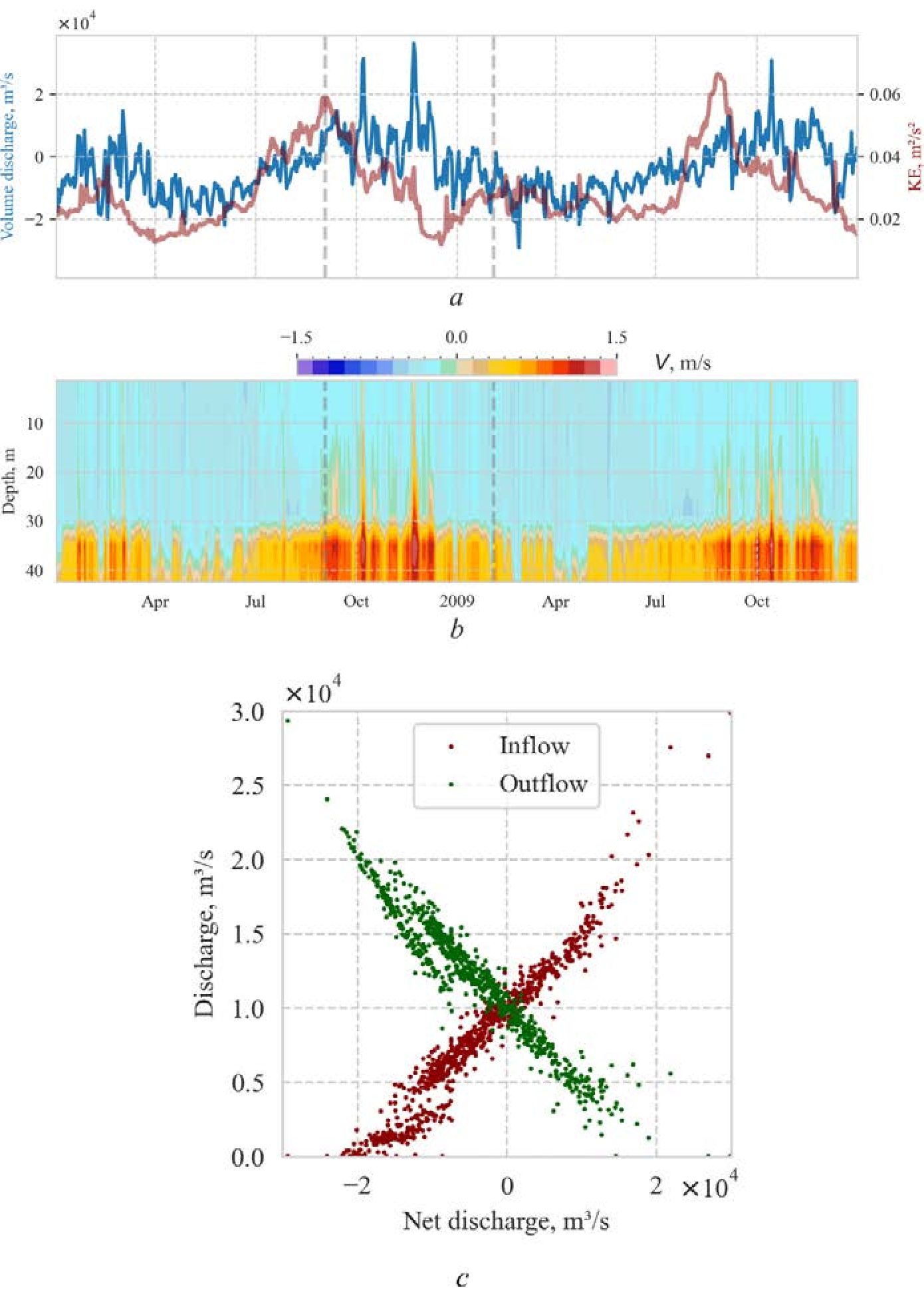 Fig. 4. Water dynamics in the Bosporus Strait: a – mean kinetic energy (CE) of surface currents in the Marmara Sea and net barotropic meridional transport in the vicinity of point BSN; b – meridional currents in the northern part (BSN); c – inflow and outflow values as the functions of total transport. Vertical dashed lines indicate the period of observations from [6]