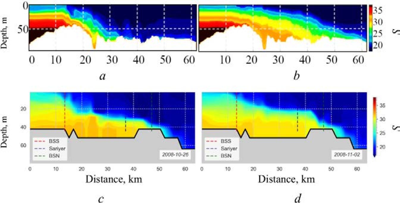 The salinity fields according to CMEMS data demonstrate a typical vertical haline structure of waters in the Marmara basin, where the salinity of the upper layer is determined by the inflow and subsequent transformation of less saline Black Sea water masses. Salinity increases significantly with depth due to the influx of Mediterranean waters, with a salinity difference of over 12 between the deep and surface waters (Fig. 2, b).