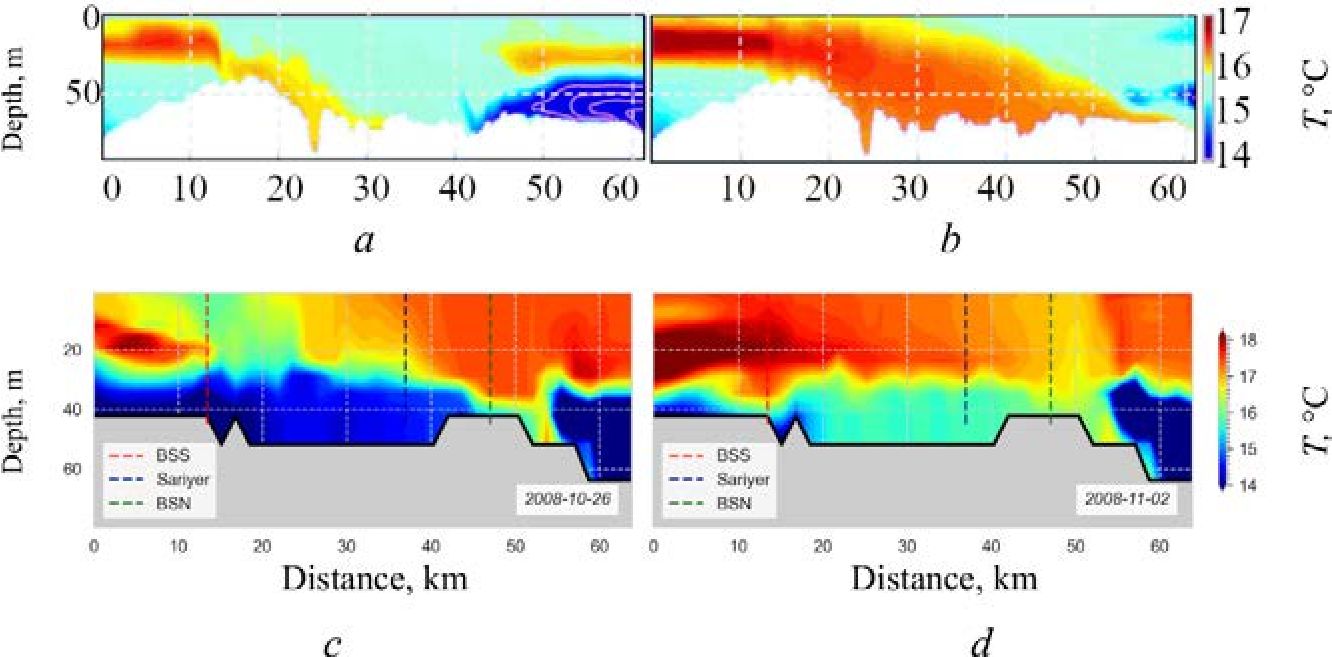 In comparison with the findings of the study [2], salinity profiles along the strait on 26 October and 2 November 2008 (Fig. 6) will be considered. In comparison to the results presented in work [2], our calculations indicate that the Marmara Sea waters extended to the north to a somewhat greater extent in October. Nevertheless, as in the aforementioned work, our calculation also reveals the obstruction of Black Sea waters at the boundary with the Marmara Sea. In both calculations, there is a tendency for the boundary to rise during the October–November period. The temperature of the bottom waters in our results was found to be lower (Fig. 7). The process of incorporating more saline, yet warmer Marmara Sea waters into the Black Sea basin is less discernible in terms of temperature.