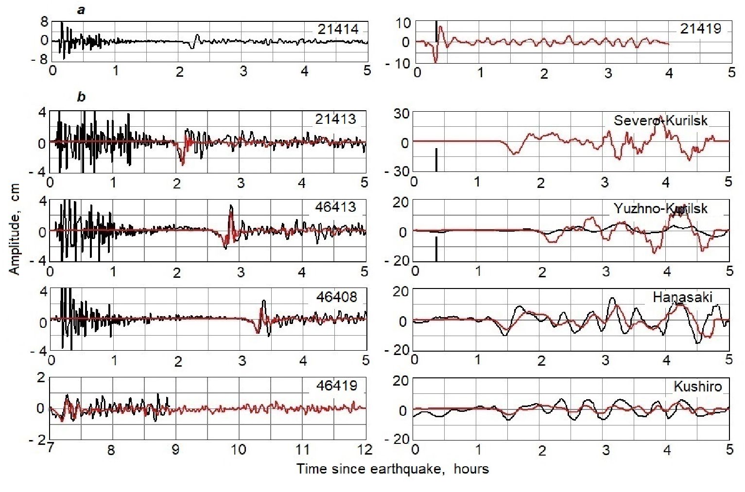 Fig. 3. Waveforms of the 2007 Simushir tsunami: a – recorded by the DART 21414 station (left) and reconstructed at DART 21419 station (right); b – recorded (black line) and computed (red line) based on the reconstructed data from DART 21419 station
