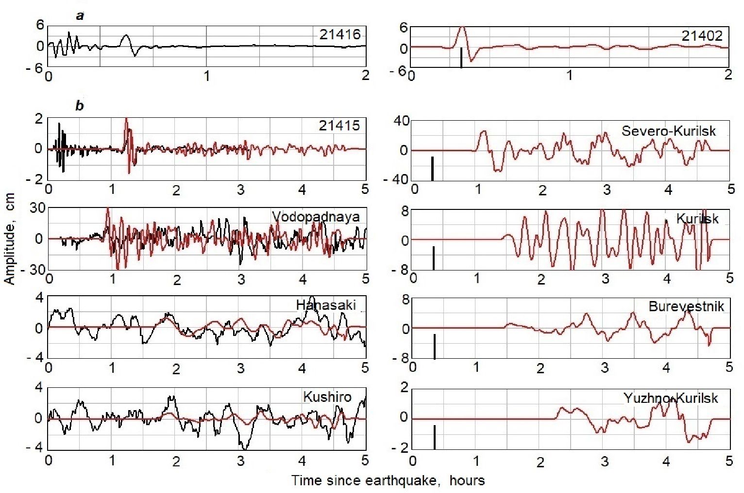 Fig. 4. Waveforms of the 2020 Onekotan tsunami: a – recorded by DART 21416 station (left) and reconstructed at DART 21402 station (right); b – recorded (black line) and computed (red line) based on the reconstructed data from DART 21402 station