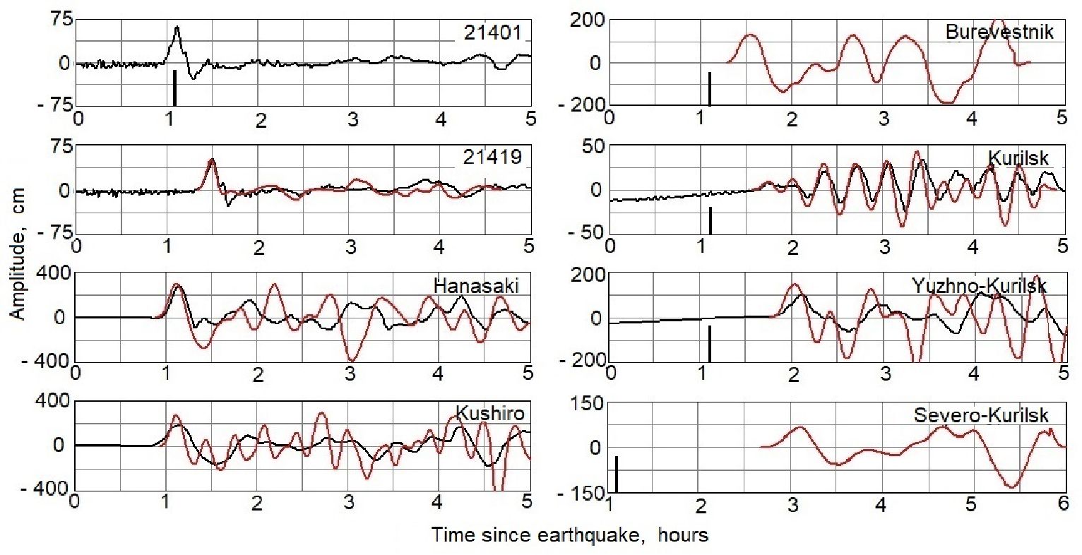 The computed and recorded tsunami waveforms in Hanasaki and Kushiro are in good agreement with each other. In Yuzhno-Kurilsk, there is also agreement between the model and real waveforms. The time of tsunami arrival at the forecast point and the wave structure coincide. According to the forecast, the amplitude of the maximum wave should not exceed 1.5 m. In Kurilsk (the Okhotsk side of Iturup Island), the structure, amplitudes and characteristic periods of the waves coincide well. In Severo-Kurilsk, the computed range of water level fluctuations should not exceed 1.5 meters, which agrees with the information from ships located near Severo-Kurilsk, where the water level under the keel fluctuated from 4.2 m to 2.6 m with a difference of 1.6 m [16]. The computed wave amplitudes (up to 2 m) correspond to visual observations in the Burevestnik port point (Iturup Island) [12].