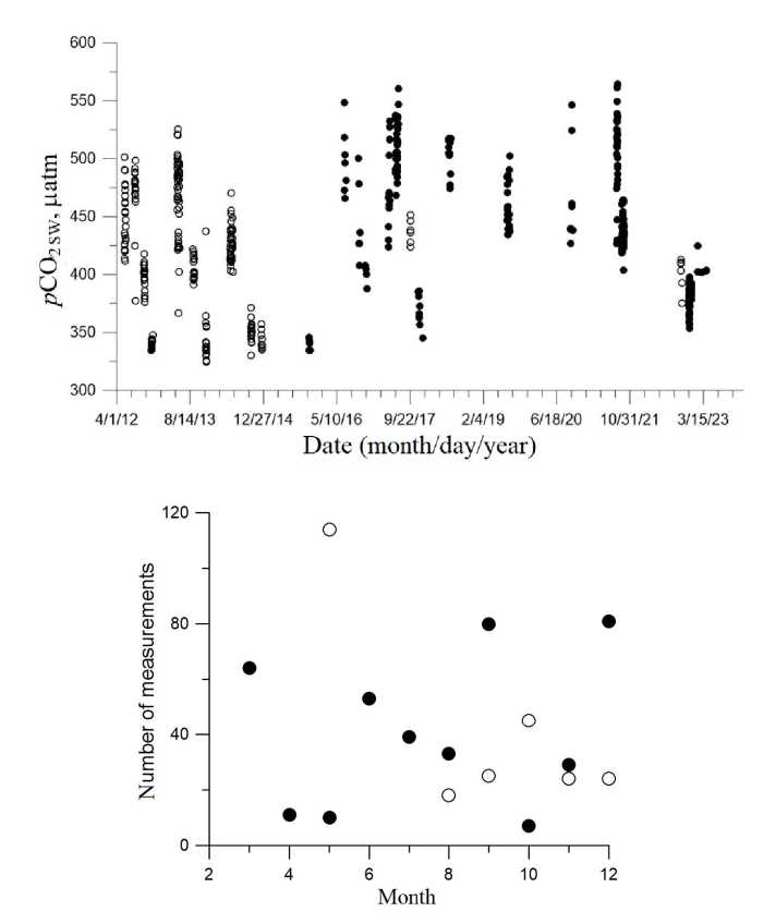 Fig. 2. Results of pCO2 sw measurements: for the whole observation period (a) and a number of measurements by months (b). Dark circles denote the ship measurements, light ones – the measurements taken at the BSHSP stationary observation point