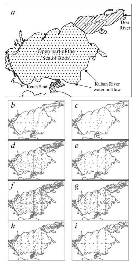 The following areas are distinguished according to the degree of impact of river and the Black Sea waters: the Taganrog Bay, the Sea of Azov open part and the Kerch Strait (Fig. 1, a). The average long-term values of the studied quantities are calculated for these areas.