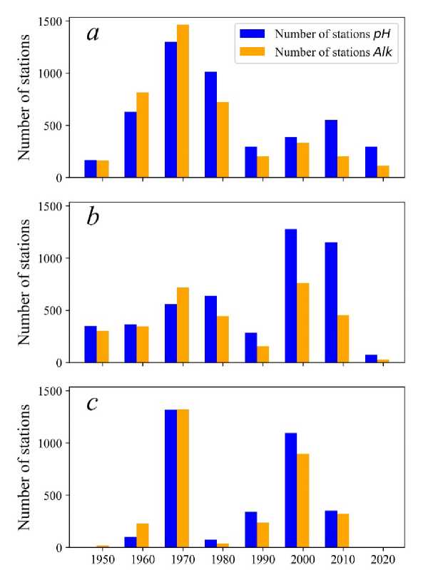 With regard to the number of stations, the 1970s represented the period with the most data, while the 1950s and 1990s had the least (Fig. 2). In general, for the sea, the 1960s and 1970s were the decades in which the majority of stations with Alk measurements were located. Other decades are characterised by a higher prevalence of stations equipped with pH measurements.