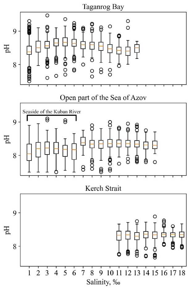 In the open sea, the mean long-term pH values are distributed relatively evenly both seasonally and geographically, with a slight decrease near the Kuban mouth (by 0.15 relative to the mean pH (8.33) over the entire salinity range of this part of the sea) (Fig. 3, Table).