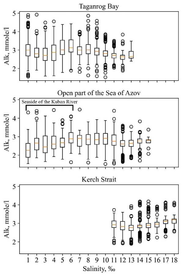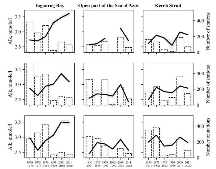 The increase in alkalinity may be related to different processes in different parts of the sea. For example, increased Alk values along the Don seaside may be due to the influx of highly alkaline river waters (3.5–4 mmole/l) 5; near the coast in the winter-spring period – due to the runoff of carbonate-enriched meltwater caused by the erosion of limestone; in the southern part of the open sea and the Kerch Strait – due to the influx of the Black Sea waters with the highest salinity.