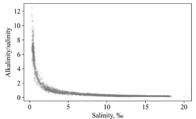 An analysis of alkalinity values in the Don estuary and the Taganrog Bay revealed different types of dependence between Alk and salinity S in this area. The first type, which is the most common, is characterized by the curve Alk = f(S) turning convex downwards at low salinity values. In contrast, the second type is characterized by a curve Alk = f(S) that is convex upwards across the entire salinity range of the Taganrog Bay.