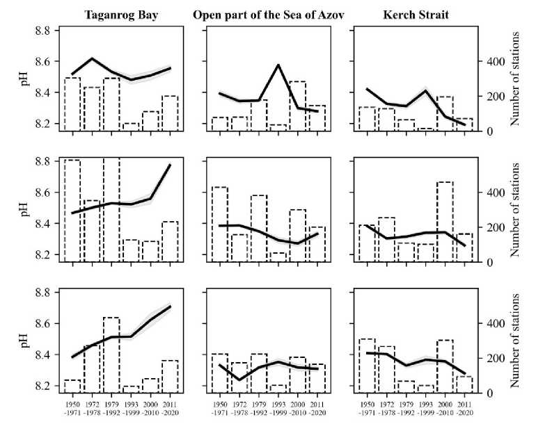 The Kerch Strait and the sea itself are characterized by similar trends in the average pH value variation in spring and summer over the entire observation period. However, in autumn, the observed changes differ, particularly during the last low-water period (2007–2020), which may be associated with relatively less active production processes in this area due to salinization.