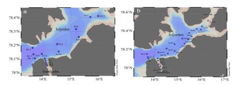 Fig.1. Sampling stations in the fjords of Western Spitsbergen in April (а) and August (b), 2023