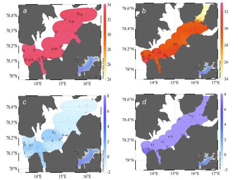 Fig.2. Distribution of hydrophysical parameters in the surface layer of the Western Spitsbergen fjords, 2023: salinity in April (а) and August (b); temperature in April (c) and August (d)
