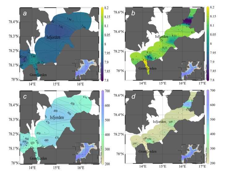 In August, pH values in the Isfjorden area were within 7.97–8.15. At the same time, pCO2 values in most of the fjord area were ~ 350 μatm, except for the local zones with elevated values of 400–450 μatm. In Grønfjorden, pCO2 varied within 276–330 μatm, and pH within the range of 8.14–8.20.