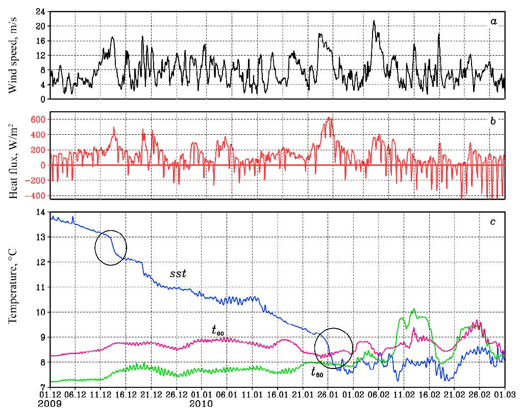 A notable feature that deviates from the prevailing trend of upper layer cooling is evident in two episodes of a sharp increase in the rate of decrease in SST: December 12–16, 2009, and particularly January 22–27, 2010 (highlighted in Fig. 1 with black circles). These episodes are accompanied by a sharp increase in surface wind speed and an increase in the heat flux from the sea surface to the atmosphere (Fig. 1, a, b). The latter episode, characterized as a case of cold air intrusion into the atmosphere of the Black Sea region, has been previously studied [7].