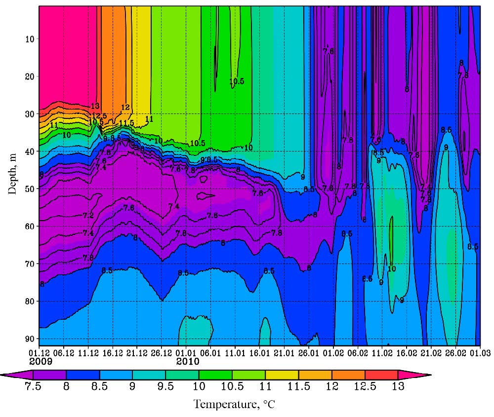Fig. 2. Change in vertical temperature profiles at point 32°E, 43.5°N for the period 01.12.2009–28.02.2010. The temperature field is smoothed over time using a sliding average of 17 points