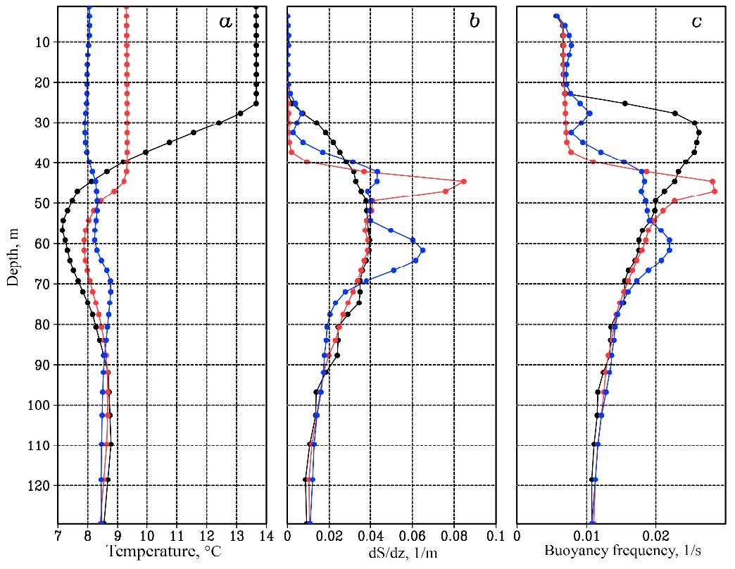 Fig. 3. Profiles of temperature (a), vertical salinity gradient (b) and buoyancy frequency (c) at point 32°E, 43.5°N in December (black curve) 2009, January (red curve) and February (blue curve) 2010