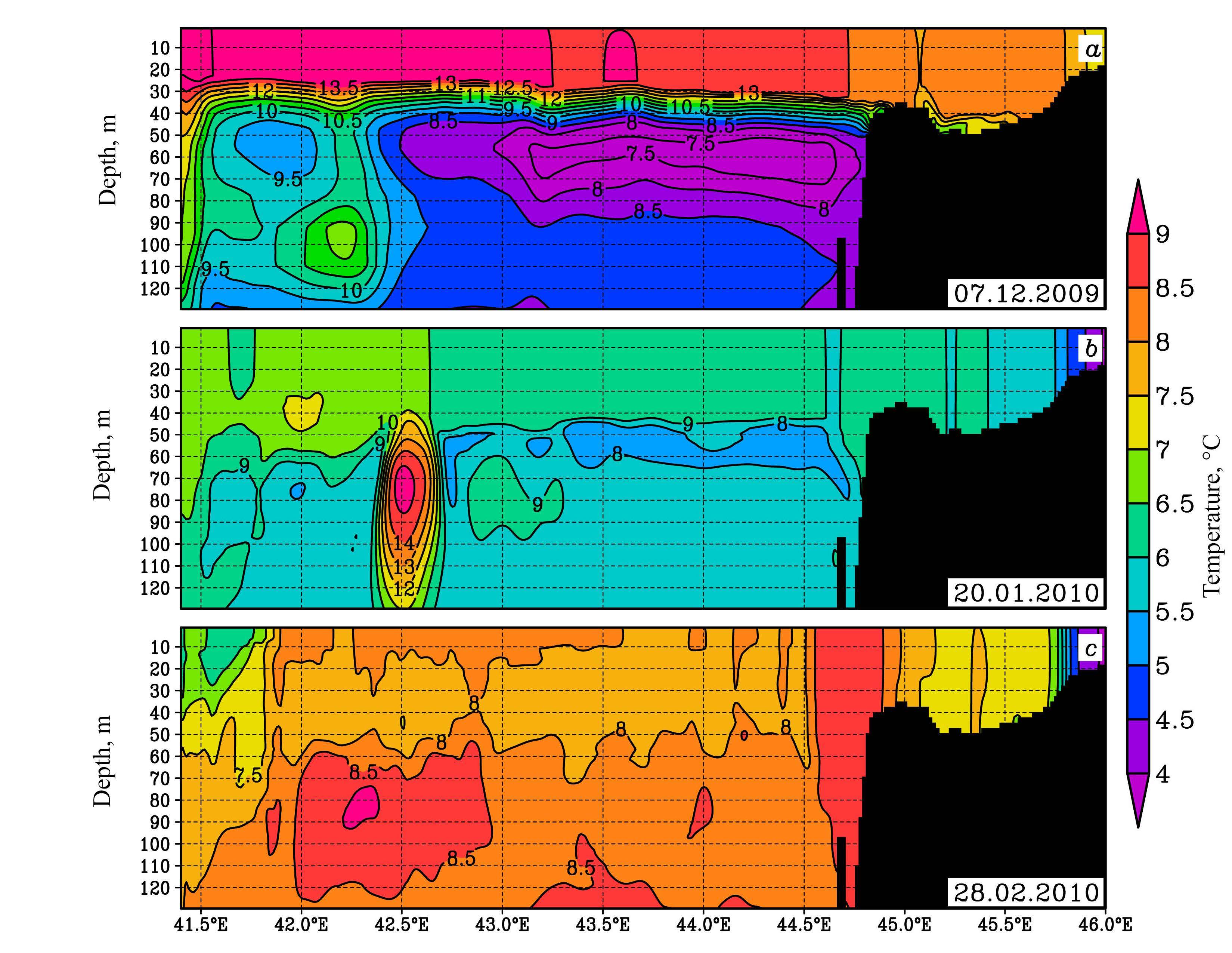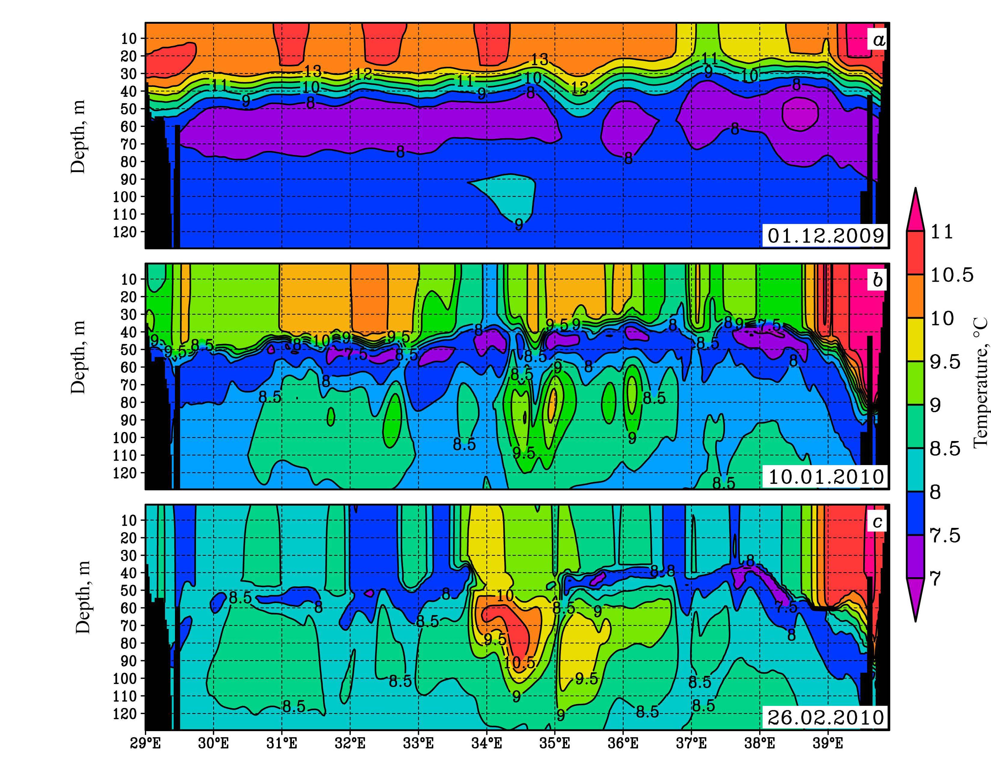 Figure 4, a, c, e, shows the spatial distribution of the minimum water temperature (tmin) in the upper 120 m layer, which is essentially the CIL core temperature, on 1 December 2009, 10 January and 26 February 2010. The arrows indicate the currents at the 20 m depth. Figure 4, b, d, f, shows the difference (∆t) between tmin and sea surface temperature for the aforementioned time moments. The ∆t can be considered as the temperature difference between the UML and the CIL core. This value may be crucial when contemplating the role of the CIL in regulating heat and mass exchange between the UML and the halocline.