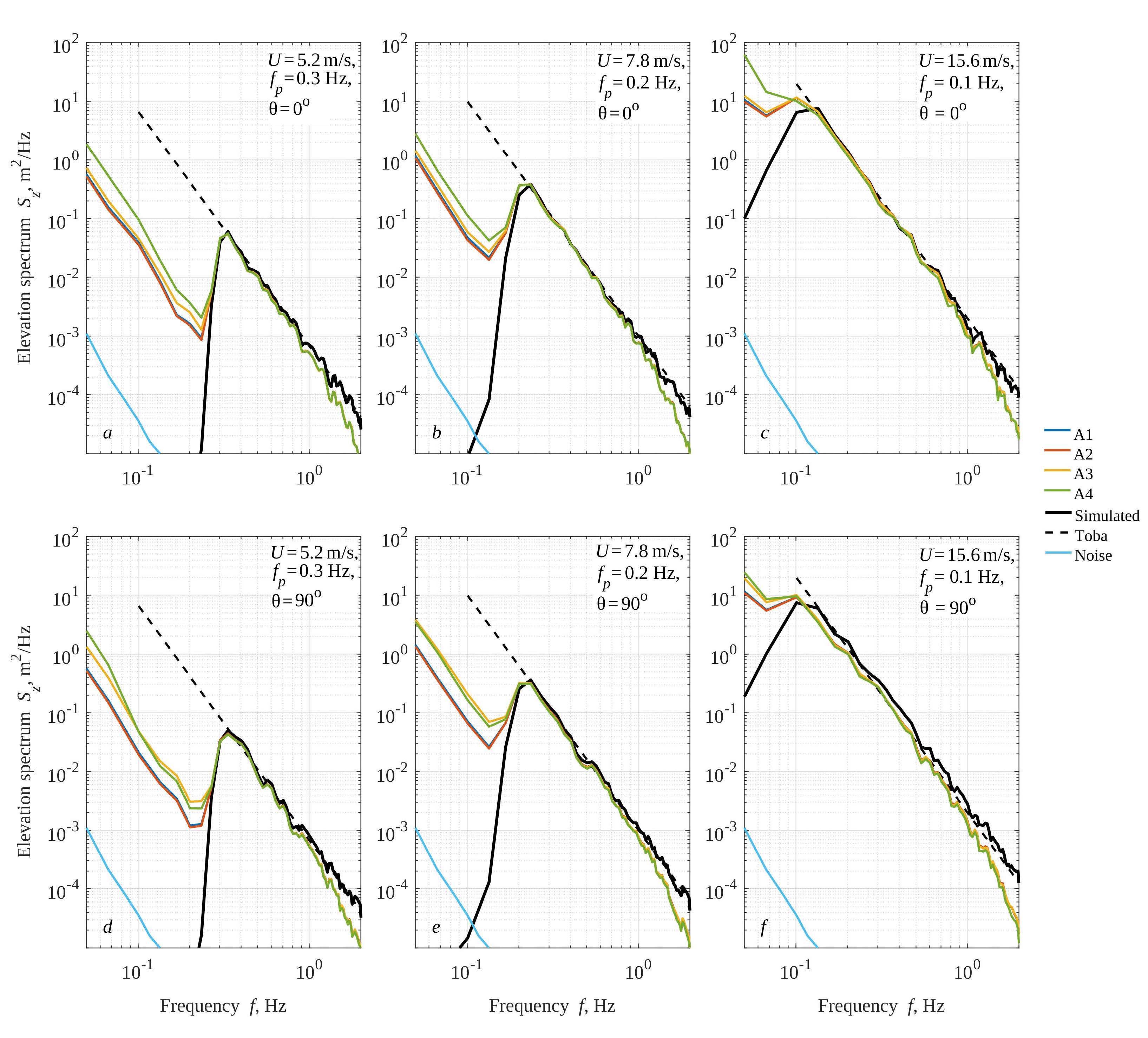 where Sz is the elevation spectrum, Sa is the acceleration spectrum, ω = 2πf is the radial frequency representing the Fourier frequency domain (not the single harmonic Ω). Similar estimates can also be written for slope spectra (or magnetic measurements) Sξ and rotation rate spectra (or gyroscope measurements) Sη, taking into account the linear dispersion relation: