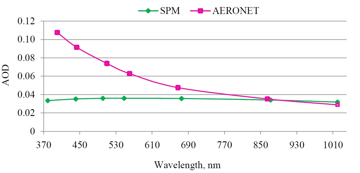 In this work, for the calculation of the AOD we use the measurements of photometers (SPM and CIMEL) at wavelengths λ within 340−2134 nm, except for the 936 nm channel, according to the measurements on which the water vapor content in the atmospheric column is determined [17, 22, 23].