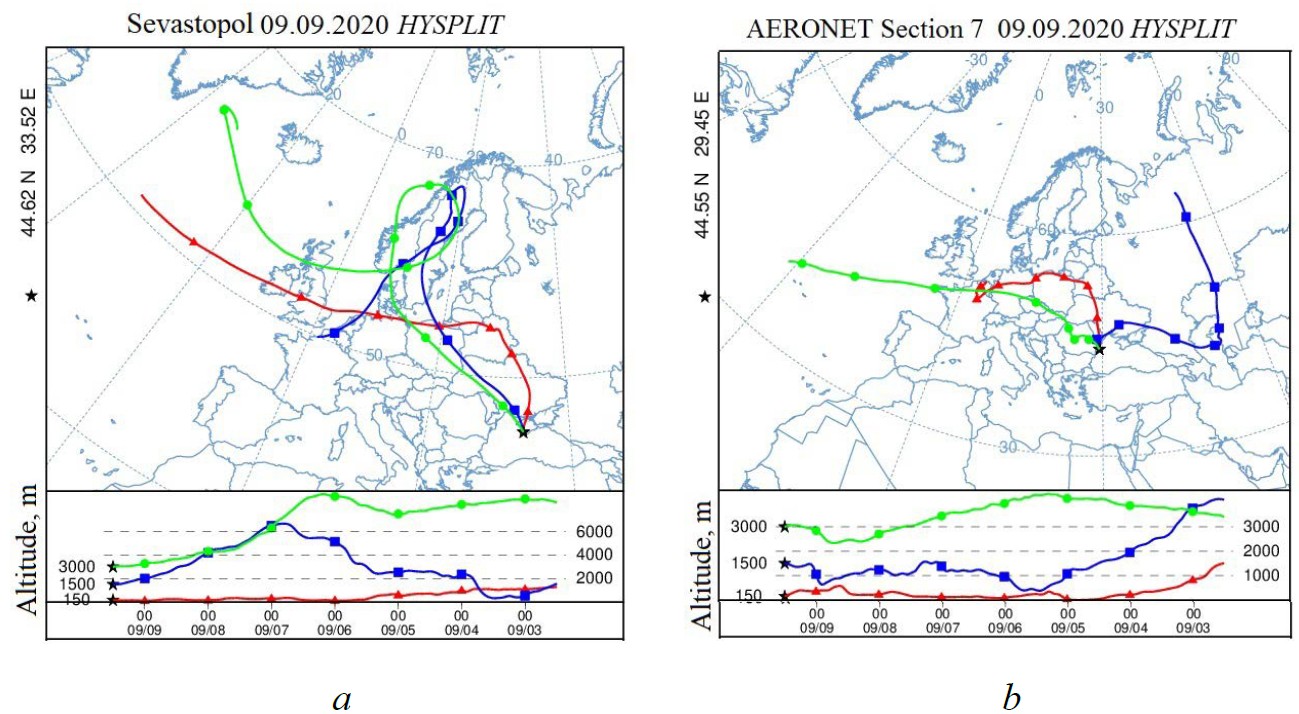 Fig. 4. Reverse trajectories of air flow transfer based on the results of HYSPLIT modeling for the stations of AERONET network: Sevastopol (а) and Section_7 (b) for 09.09.2020 (Available at: http://ready.arl.noaa.gov/HYSPLIT.php)