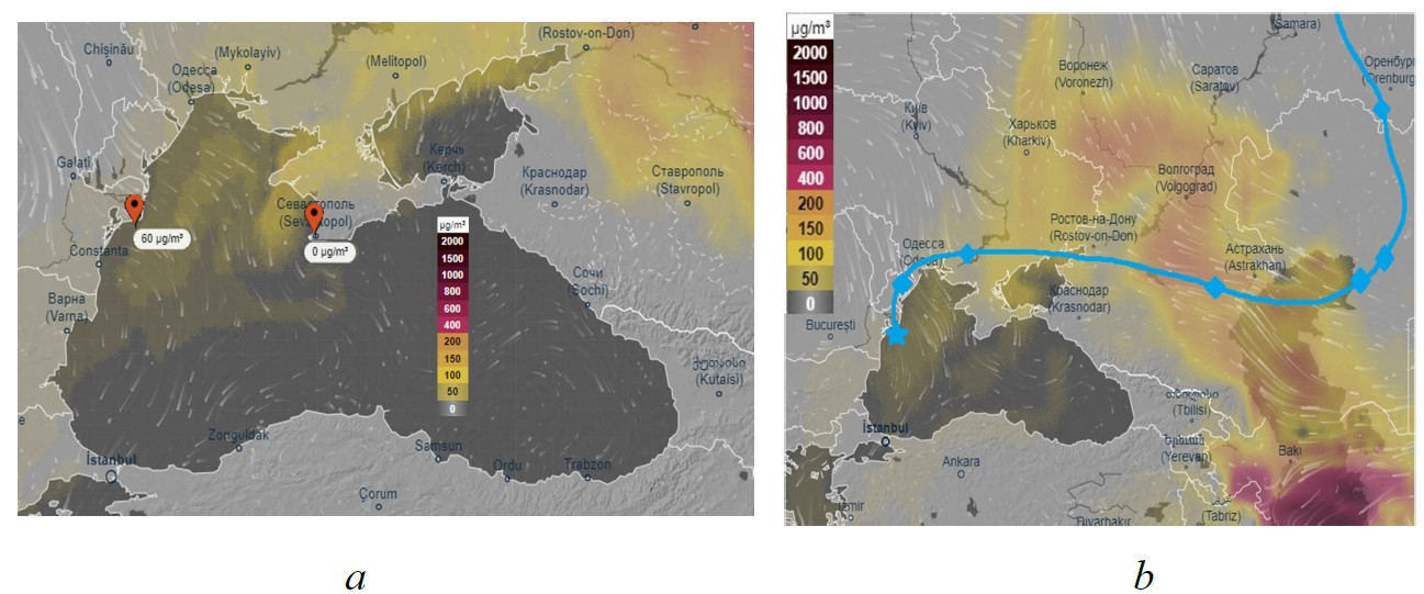 The dust aerosol loading data from the SILAM model were used to obtain the dust concentrations for both stations. As shown in Fig. 5, a, the dust concentration at Sevastopol station on 09.09.2020 was zero (no dust detected), while at the western Black Sea station its value reached 60 μg/m3 at 14:00. According to Figure 5, b, the source of dust activity on this day moved from the Karakum Desert along the Caspian Sea towards the northwest, and the reverse trajectories, according to the HYSPLIT model results for Section_7 station, passed precisely through the area of the dust cloud (see Fig. 4, b).