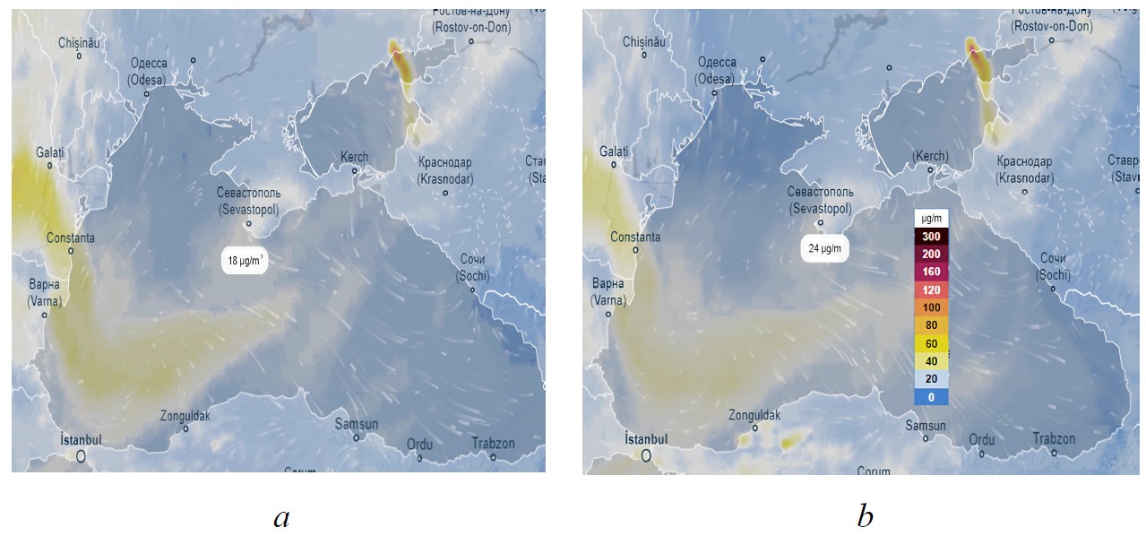 For the day with the maximum variation of the α-values, the HYSPLIT modeling data of the reverse trajectories (Fig. 4) and the SILAM loading data of the dust aerosol (Fig. 5) were analyzed. The HYSPLIT model results revealed that at two heights (2000 and 3000 m) the transport from the northeast is recorded for both stations. The data on the transport direction at 1500 m height are different: for the western Black Sea station Section_7 transport from the northeast is observed, and for Sevastopol station (as well as for two other heights) – from the northwest (Fig. 4, a).