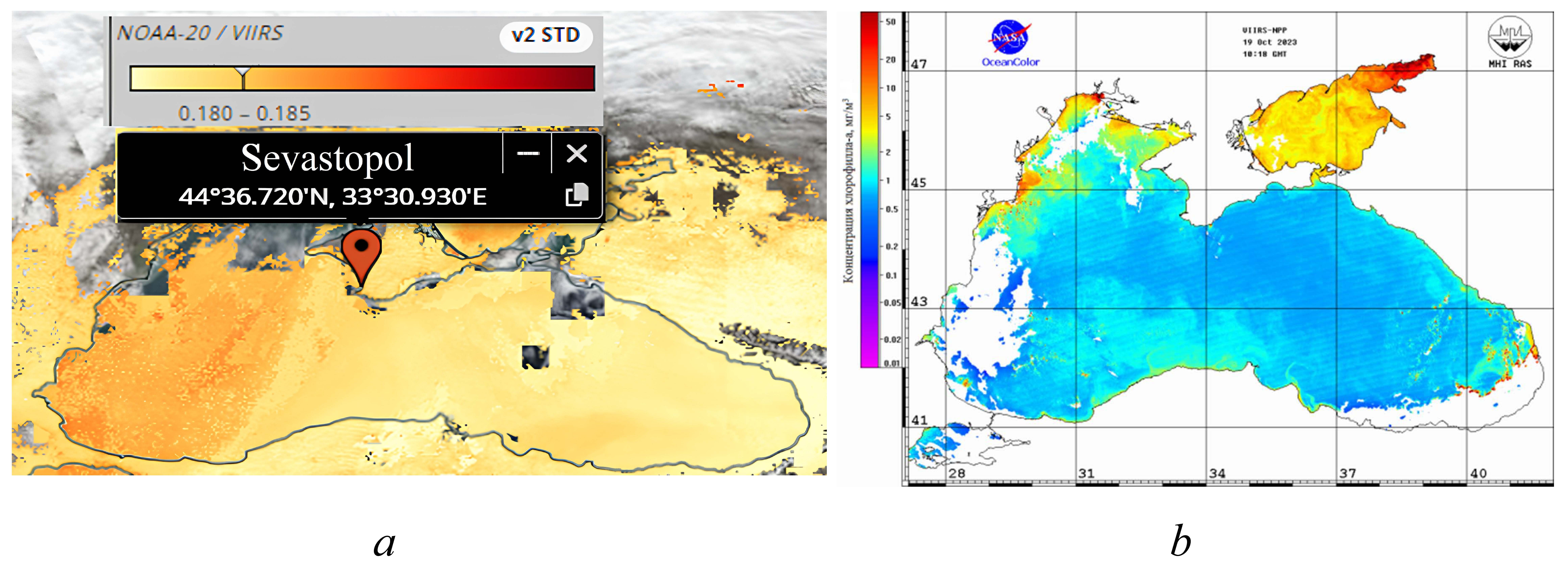 Fig. 10. Spatial distribution of aerosol optical depth at a wavelength 500 nm (а) and chlorophyll a concentration based on the VIIRS satellite data obtained over the Black Sea region (b) for 19.10.2023