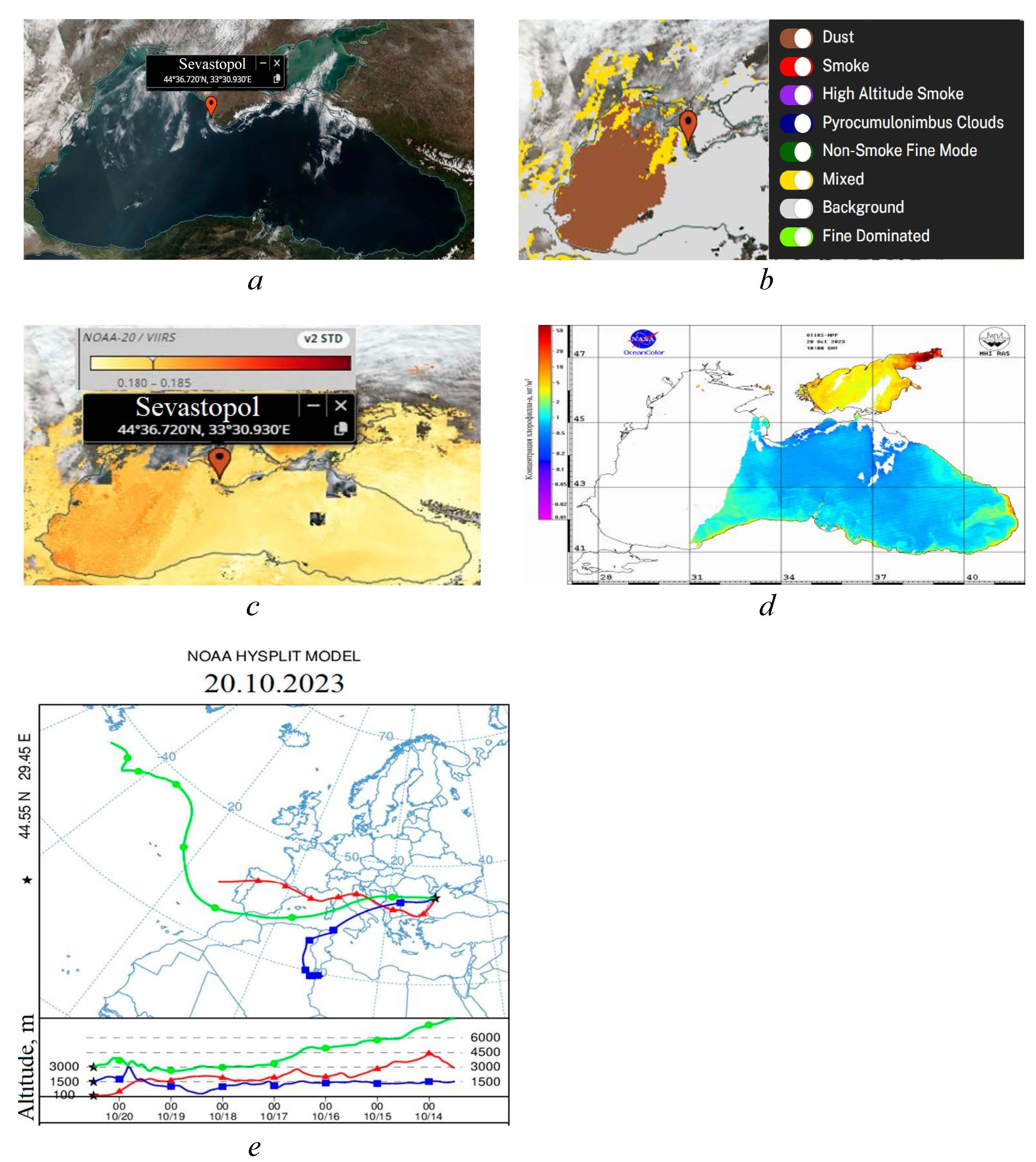 Fig. 11. Satellite images: color-synthesized in natural colors (TrueColor) (а), obtained using the Satellite Ocean Aerosol Retrieval algorithm (b), obtained using the AOD(500) satellite measurements (c) and chlorophyll a concentration (d) based on the VIIRS satellite data obtained over the Black Sea region on 20.10.2023; reverse trajectories of air flow transfer based on the results of HYSPLIT modeling for the western Black Sea station