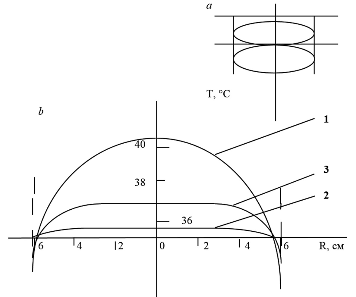 Рис. 1. Схематическое изображение организма человека в виде цилиндра (а); распределение температуры в тканях по диаметру цилиндра (b): 1 — только при кондуктивном переносе тепла; 2 — при кондуктивном переносе тепла в ядре и конвективном переносе в оболочке (что соответствует экспериментальному распределению тепла в тканях организма); 3 — только при конвективном переносе тепла. По оси ординат в центре — шкала температуры (°C), по оси абсцисс — диаметр цилиндра (см)
