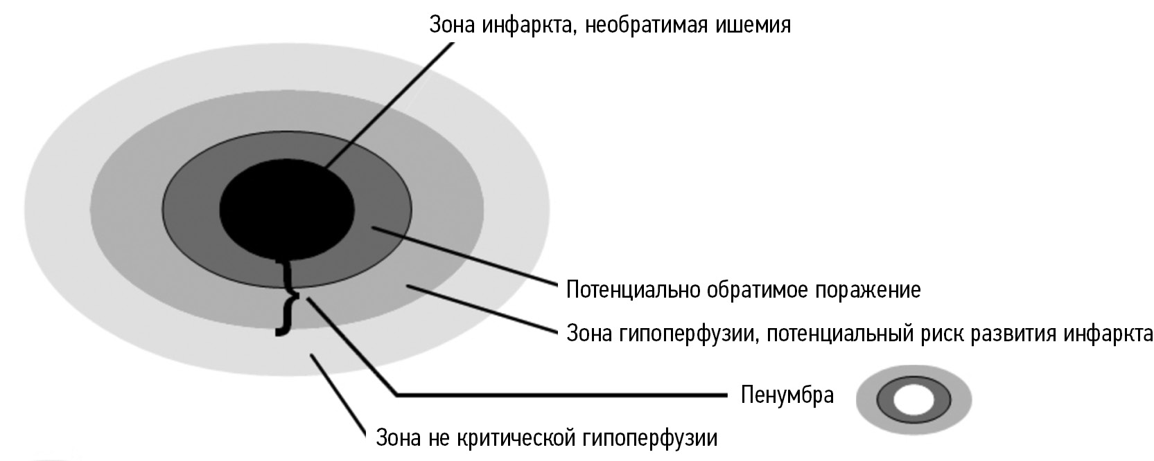 Метаболизм кислорода и глюкозы в наибольшей мере страдает в центральной зоне ишемизированной территории, в меньшей — в демаркационной зоне (рис. 1) [59]. Область мозга с наиболее выраженным снижением кровотока очень быстро, в течение 6–8 мин с момента развития острого нарушения мозгового кровотока, становится необратимо поврежденной. В течение нескольких часов центральный «точечный» инфаркт окружен ишемизированной, но живой тканью, так называемой зоной ишемической полутени, или пенумбры (penumbra).