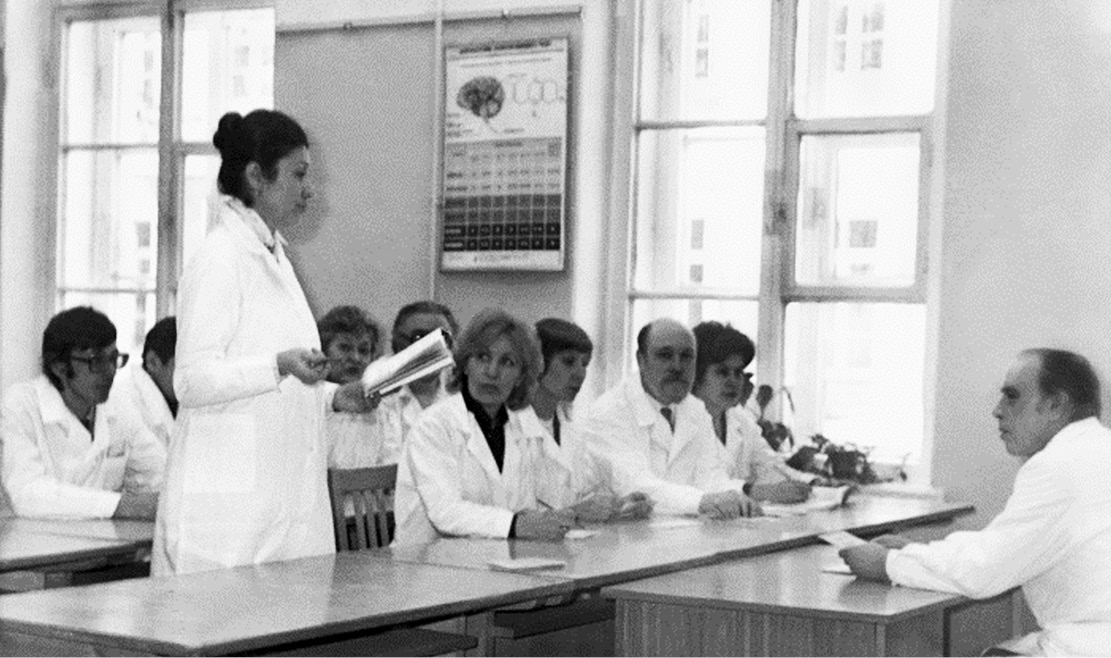Fig. 10. V.M. Vinogradov conducted an educational and methodological meeting of the department (1983)