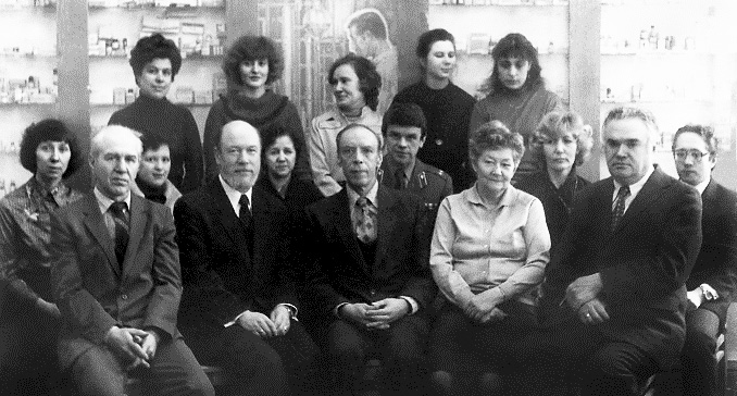 Fig. 11. V.M. Vinogradov (sitting in the center) among the employees of the Department of Pharmacology (1985)