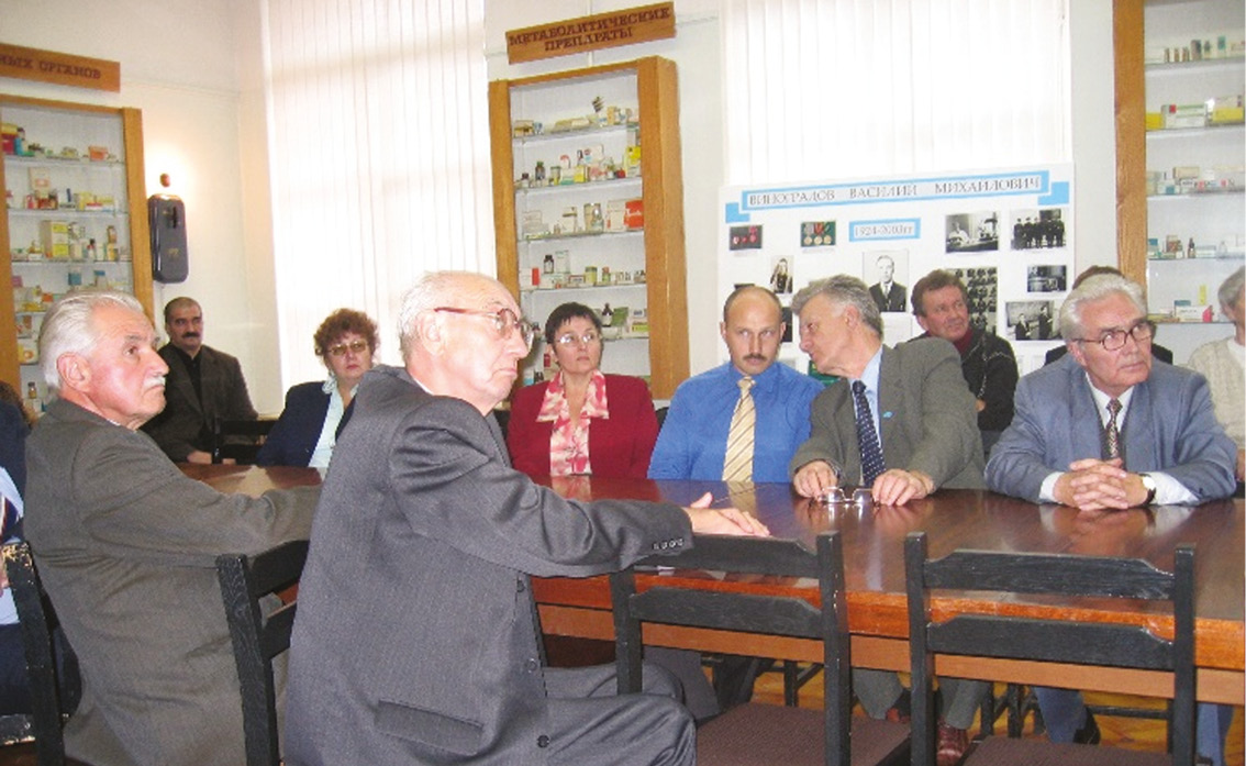 Fig. 13. At a meeting of the Society of Pharmacologists of St. Petersburg dedicated to the 80th anniversary of V.M. Vinogradov (Department of Pharmacology of the Military Medical Academy, September 2004). First row from left to right at the table: N.A. Losev and Yu.D. Ignatov; second row: Sh. K. Meshcherov, I.V. Okunevich, L.K. Khnychenko, S.V. Okovity, G.I. Dyachuk, and N.S. Sapronov
