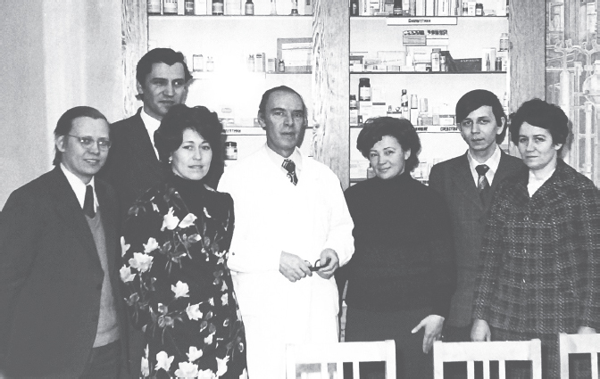 Fig. 13. V.M. Vinogradov (in the center) with students of the Faculty of Advanced Training; photo was taken in 1979
