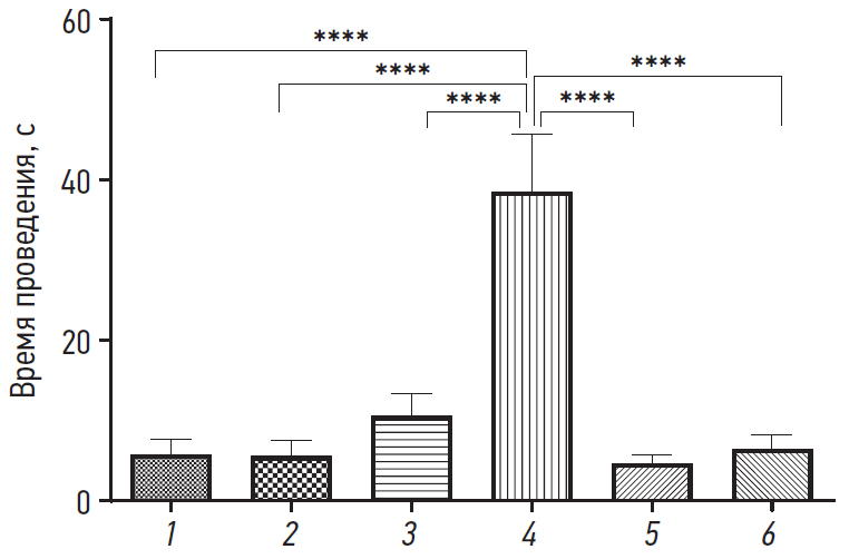 Рис. 1. Время проведения в открытых рукавах у групп мышей после введения окситоцина. 1 — интактные мыши; 2 — внутрибрюшинное введение 50 мкл окитоцина 5 МЕ; 3 — внутрибрюшинное введение 300 мкл окситоцина 5 МЕ; 4 — интраназальное введение 20 мкл окситоцина 5 МЕ; 5 — ложное интраназальное введение (интраназальное введение 20 мкл физиологического раствора); 6 — ложное внутрибрюшинное введение (внутрибрюшинное введение 300 мкл физиологического раствора). ****p < 0,0001