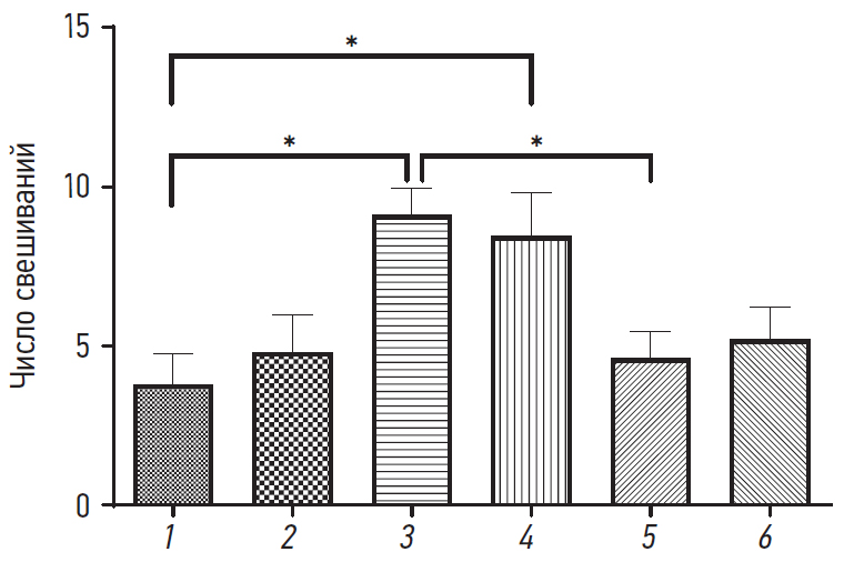 Рис. 3. Число свешиваний с открытых рукавов после введения окситоцина. 1 — интактные мыши; 2 — внутрибрюшинное введение 50 мкл окитоцина 5 МЕ; 3 — внутрибрюшинное введение 300 мкл окситоцина 5 МЕ; 4 — интраназальное введение 20 мкл окситоцина 5 МЕ; 5 — ложное интраназальное введение (интраназальное введение 20 мкл физиологического раствора); 6 — ложное внутрибрюшинное введение (внутрибрюшинное введение 300 мкл физиологического раствора). *p < 0,05