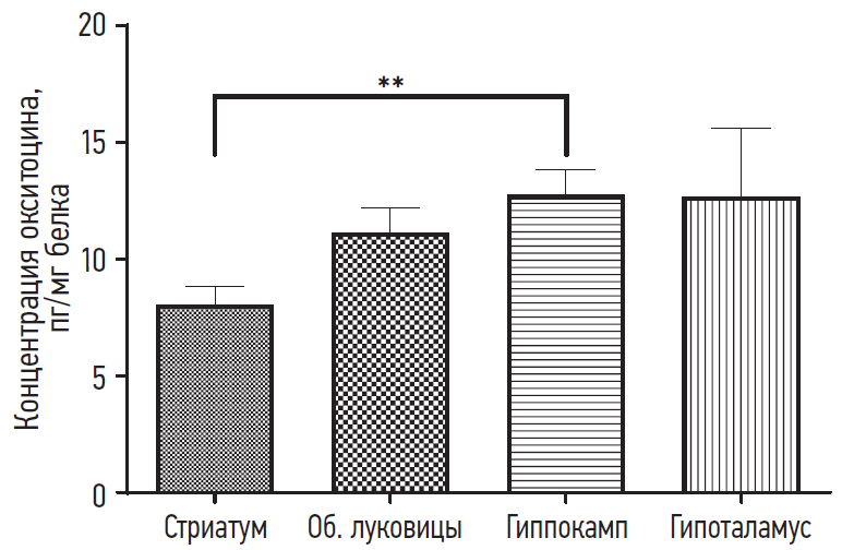 При определении содержания содержания окситоцина в различных областях мозга (стриатум, обонятельные луковицы, гиппокамп и гипоталамус) было обнаружено увеличение содержания окситоцина в обонятельных луковицах (11,12 ± 1,05) и гипоталамусе (12,68 ± 2,96), достоверное отличие содержания окситоцина наблюдалось в гиппокампе (12,75 ± 1,06), по сравнению с содержанием в стриатуме (8,03 ± 0,79, p ≤ 0,01) (рис. 4).