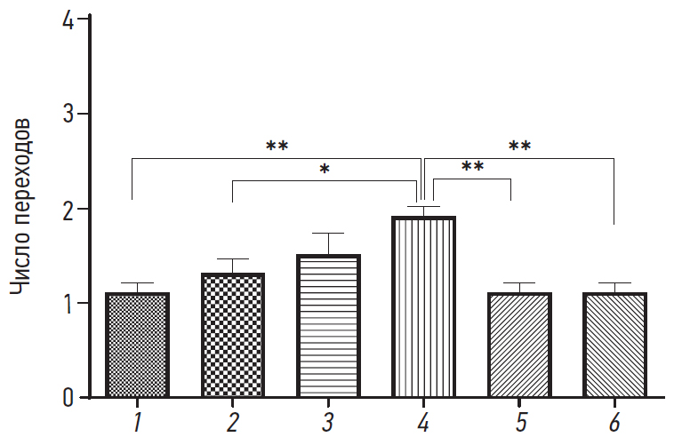 Рис. 2. Число переходов в рукава крестообразного лабиринта после введения введения окситоцина. 1 — интактные мыши; 2 — внутрибрюшинное введение 50 мкл окитоцина 5 МЕ; 3 — внутрибрюшинное введение 300 мкл окситоцина 5 МЕ; 4 — интраназальное введение 20 мкл окситоцина 5 МЕ; 5 — ложное интраназальное введение (интраназальное введение 20 мкл физиологического раствора); 6 — ложное внутрибрюшинное введение (внутрибрюшинное введение 300 мкл физиологического раствора). *p < 0,05; **p < 0,001