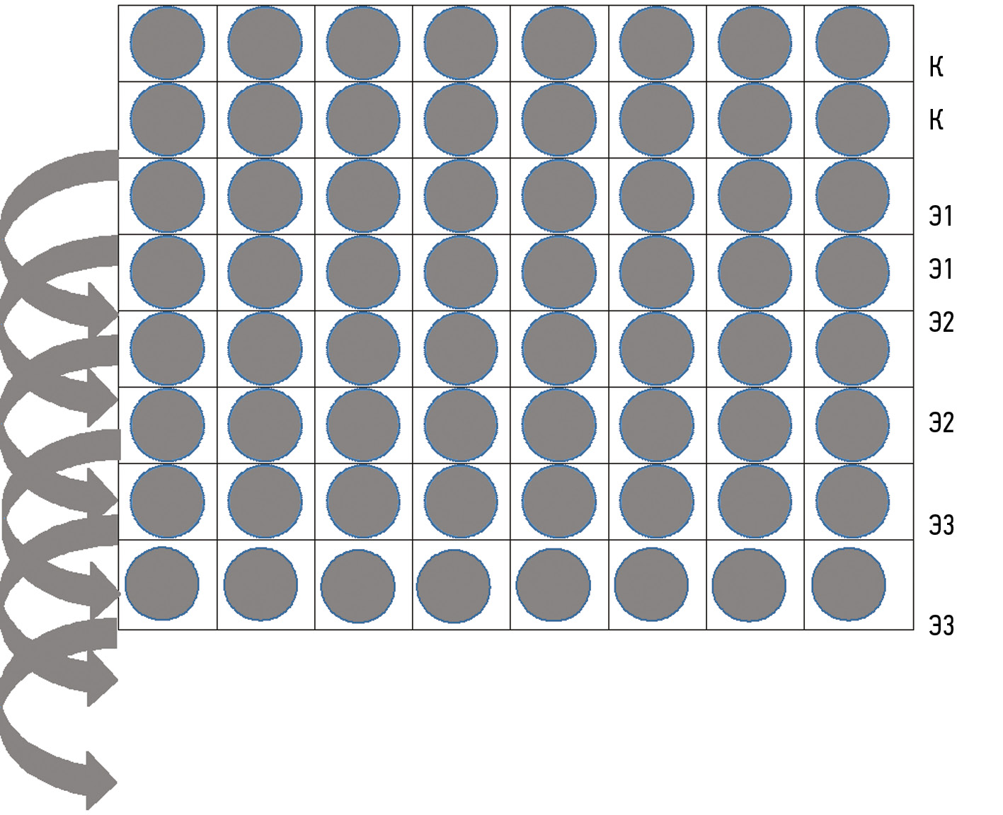 Рис. 1. Схема эксперимента: К — контроль; Э1 — доза I нуклеоспермата натрия (50 мкг/200 мкл на лунку), Э2 — доза II (1,3 мкг/200 мкл), Э3 — доза III (0,0325 мкг/200 мкл). Лунки содержали ту же воду из резервуара, в котором получали икру. Температура воды в лунках +23 °С