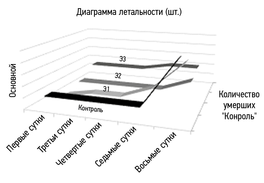 Как показали результаты исследования, на 1-е сутки в контроле кровообращение регистрировали у всех эмбрионов, а движение — лишь у 21,4 % (рис. 2). При исследовании нуклеоспермата натрия в дозе I кровообращение у эмбрионов регистрировали с частотой 37,5 %, а движение — с частотой 6,25 %. При исследовании нуклеоспермата натрия в дозе II кровообращение выявляли у всех эмбрионов, тогда как движение —только у 46,6 %. При исследовании препарата в дозе III кровообращение зафиксировано у всех эмбрионов, движение — у 18,75 %. На 3-и сутки добавляли новый параметр оценки жизнедеятельности эмбрионов (в некоторых случаях уже личинок Danio rerio) — появление на свет личинки, параметр «движение» оценивали по передвижению личинки по экспериментальной лунке, а не внутри икринки (рис. 3, 4). В контроле кровообращение зарегистрировано у 87,5 % эмбрионов, движения не наблюдали, появилось на свет 87,5 % личинок. При исследовании препарата в дозе I кровообращение определялось у 87,5 % эмбрионов, движения не наблюдали, на свет появилось 81,25 % личинок. При исследовании препарата в дозе II кровообращение наблюдали у 93,75 % эмбрионов, движение отсутствовало, на свет появилось 93,75 % личинок. При исследовании препарата в дозе III кровообращение наблюдали у 81,25 % эмбрионов, движение — у 37,5 %, на свет появилось 81,25 % личинок. Эксперимент на 4-е сутки показал, что в контроле кровообращение, движение и появление на свет были у 87,5 % эмбрионов. При исследовании препарата в дозе I кровообращение и движение регистрировали у 93,75 % эмбрионов, появление на свет — у 18,75 %. При исследовании препарата в дозе II все параметры составляли 93,75 %. При исследовании препарата в дозе III все параметры соответствовали 81,25 %. На 7-е сутки исследования все три параметра в каждой дозе сравняли свое значение: контроль — 87,5 % кровообращение, движение, появление на свет, доза I — 81,25 %, доза II — 93,75 %, доза III — 75 %. На 8-е сутки оценивали только активное передвижение личинки по экспериментальной лунке, так как все остальные показатели составляли 100 % для выживших эмбрионов. Эксперимент на 8-е сутки показал, что в контроле активно двигаются и удовлетворительно развиваются 37,5 % первоначально взятых живых эмбрионов, при введении нуклеоспермата натрия в дозе I — 50 %, в дозе II — 81,25 %, в дозе III — 75 % (рис. 5).