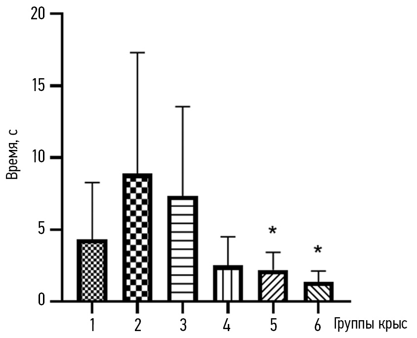 Рис. 4. Время, проведенное возле самки, в тесте аппетентного поведения: по оси ординат — время (с), по оси абсцисс — группы крыс: 1 — контроль (интактные); 2 — крысы с ПТСР; 3 — крысы с ПТСР + бусерелин; 4 — крысы с ПТСР + кисспептин-10 внутрибрюшинно; 5 — крысы с ПТСР + кисспептин-10 интраназально; 6 — крысы с ПТСР + йохимбин. *p < 0,05 между 2-й и 5-й группами.