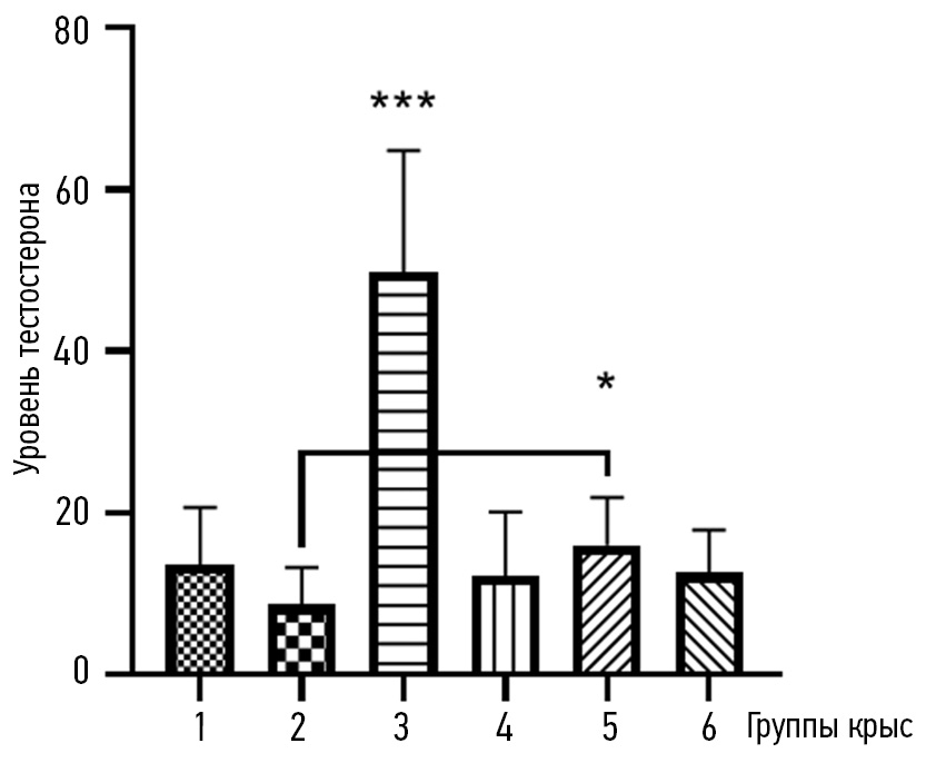 Fig. 5. Level of testosterone in the blood serum of rats. The ordinate and abscissa axes present the testosterone level (µg/L) and groups of rats, respectively: 1 — control (intact); 2 — rats with PTSD; 3 — rats with PTSD + buserelin; 4 — rats with PTSD + kisspeptin-10 intraperitoneally; 5 — rats with PTSD + kisspeptin-10 intranasally; 6 — rats with PTSD + yohimbine. *p < 0. 05 between the second and fifth groups, ***p < 0. 01 to all groups except for the third group