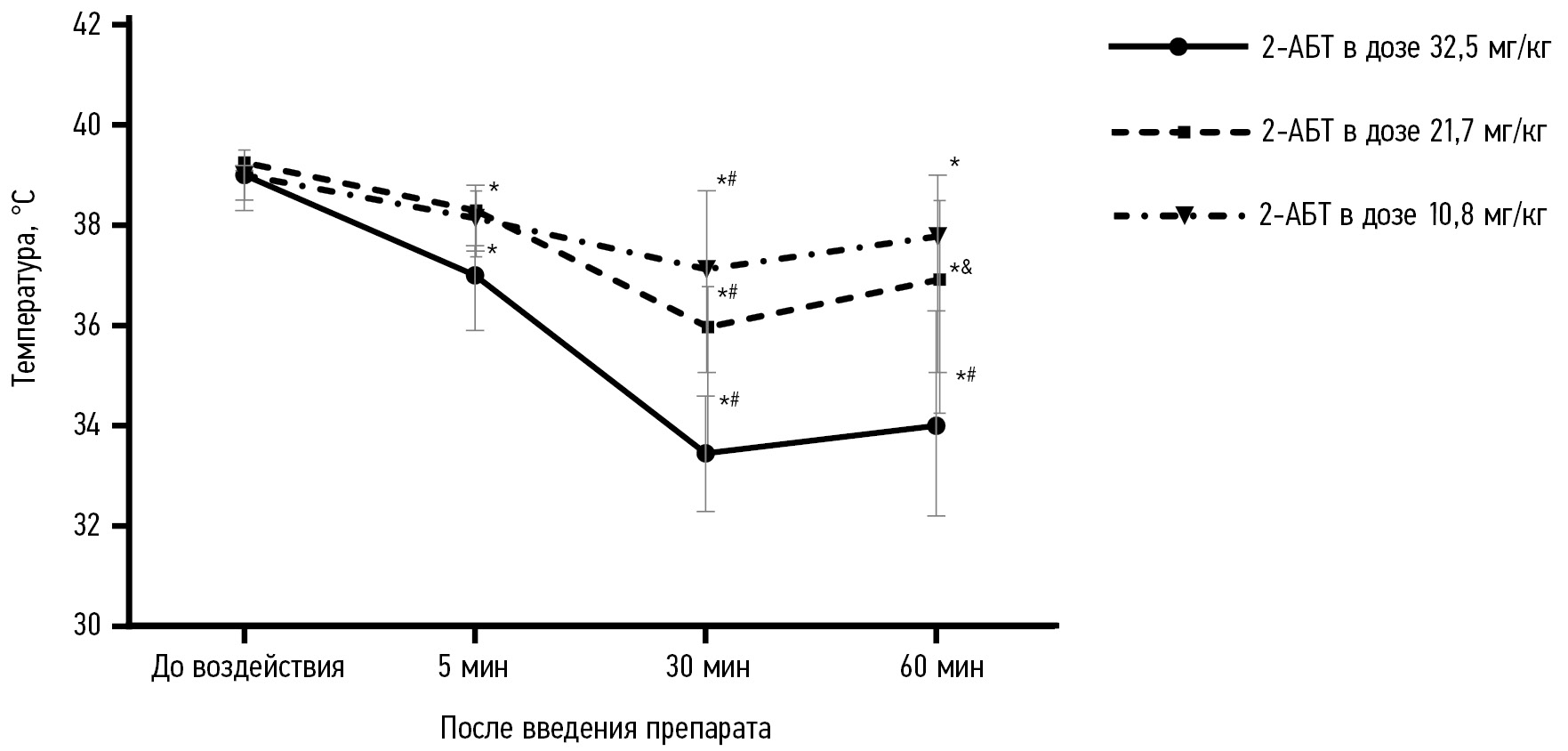До введения 2-АБТ у мышей всех трех групп температура тела значимо не различалась (см. табл., рис.). Однако уже через 5 мин отмечены статистически значимые различия между группами животных, получавших 2-АБТ в дозах 10,7 и 32,5 мг/кг (р = 0,0087) и 21,7 и 32,5 мг/кг (р = 0,0087) (см. табл., рис.). Через 30 мин также наблюдалось статистически значимое различие между дозами 10,7 и 32,5 мг/кг (р = 0,0022) и группой с дозами 21,7 и 32,5 мг/кг (р = 0,0173) (см. табл., рис.). Максимальный гипотермический эффект отмечен при введении 2-АБТ в дозе 32,5 мг/кг. Через 60 мин гипотермический эффект сохранялся, при этом были выявлены значимые различия между эффектами препарата в дозах 10,7 и 32,5 мг/кг (р = 0,0087) и 21,7 и 32,5 мг/кг (р = 0,0152) (см. табл., рис.).