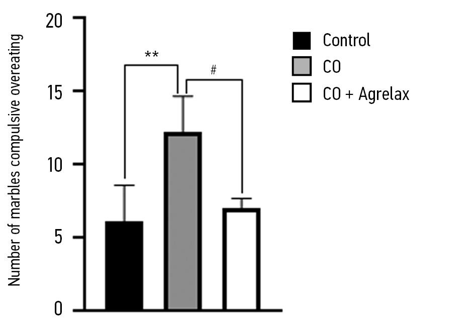 Fig. 1. Compulsive behavior assessment in the marble burying test. CO — compulsive overeating. **p < 0.01; #p < 0.05