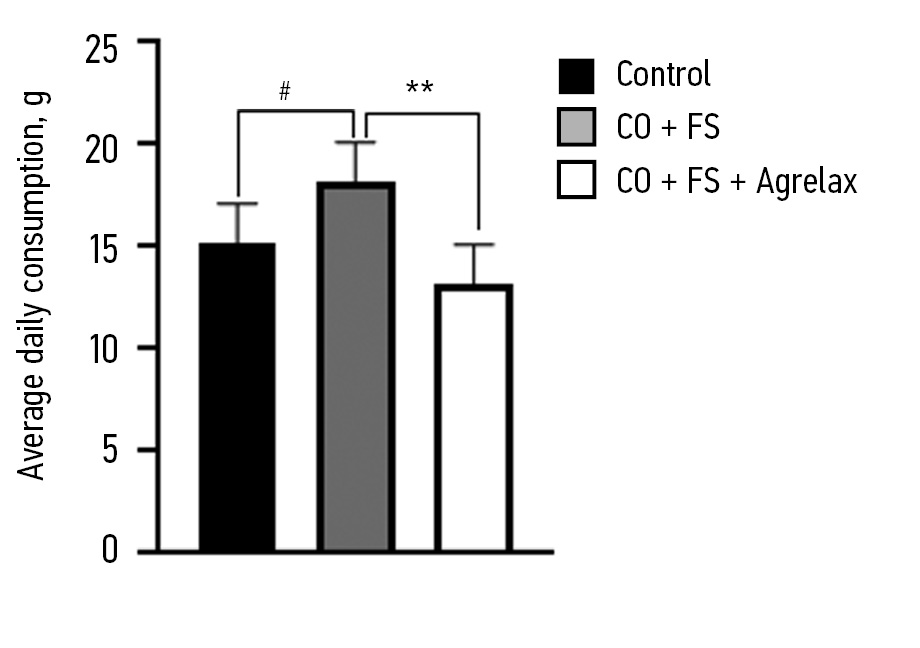 Fig. 3. Effects of limb electrical stimulation and agrelax on the consumption of chocolate-feed mix in the compulsive overeating (CO) rat model. #p < 0,05; **p < 0,01