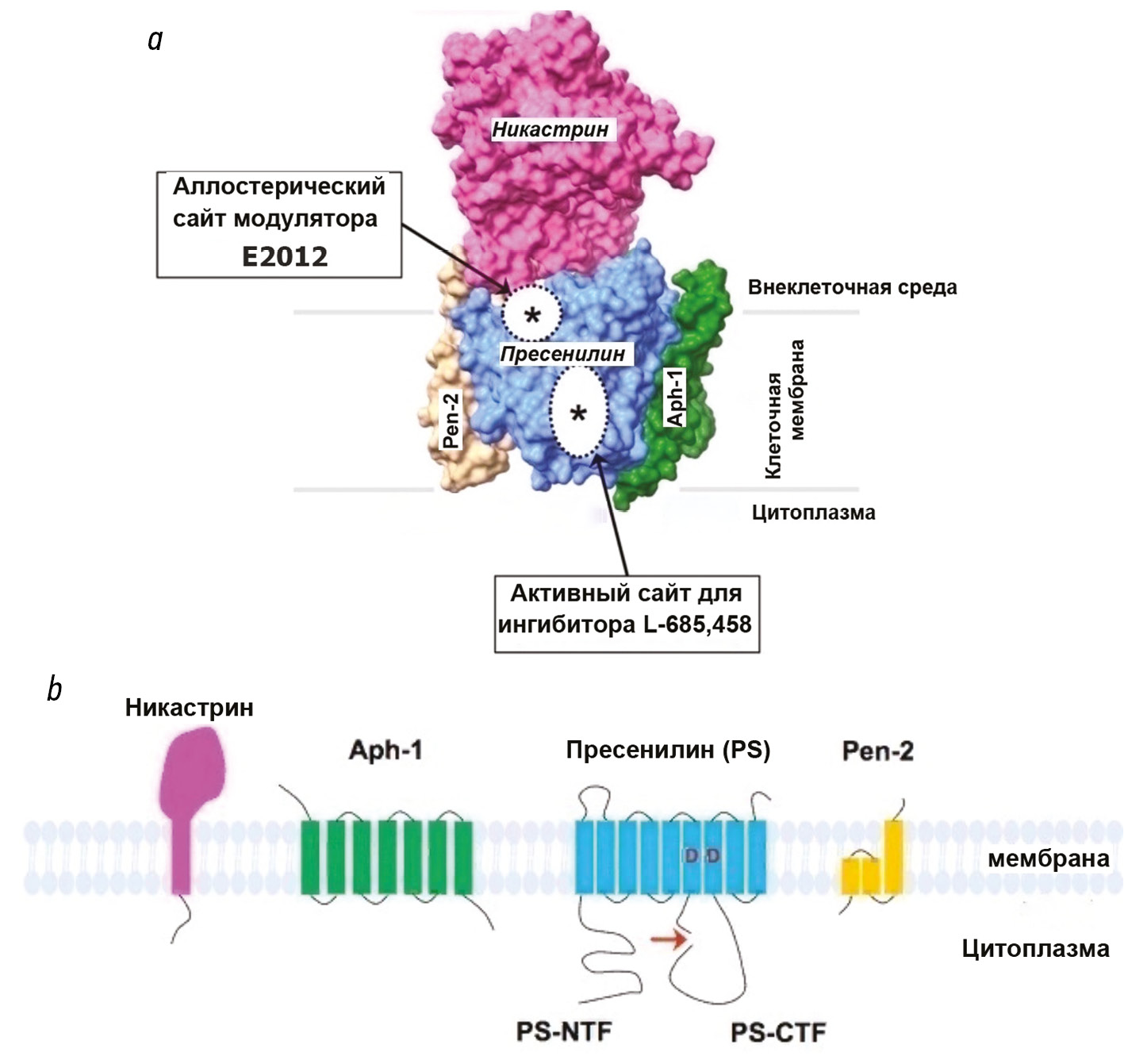 Детальными исследованиями установлено, что γ-секретаза представляет собой трансмембранный белковый комплекс из 4 субъединиц: пресенилина, никастрина, а также компонентов Aph-1 и Pen-2 (рис. 4). γ-Секретаза относится к особому классу внутримембранных аспартатпротеаз I типа (I-CliPs), расщепляющих АРР, и ее необычное расщепление перерабатывает субстраты непосредственно в липидном бислое мембран [154].