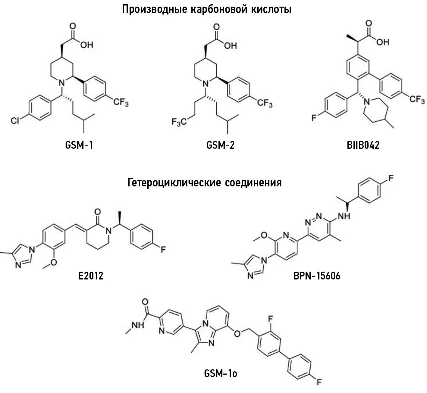 Гетероциклические модуляторы снижают уровни Aβ40 и Aβ42, одновременно повышая уровни Aβ37 и Aβ38. E2012 стал первым не относящимся к НПВП модулятором, испытания которого были проведены в клинических условиях.