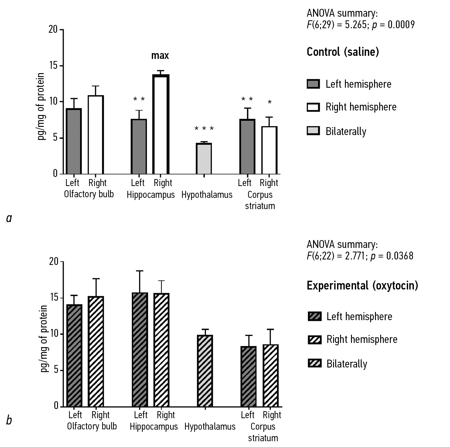 Fig. 1. Oxytocin levels in the mouse brain (pg/mg of protein): a, after saline administration; b, after oxytocin administration. Notes: “Left”, left side of the brain; “Right”, right side of the brain. Brain areas assessed: olfactory bulb, hippocampus, hypothalamus, and striatum. In fragment a, the bar representing oxytocin concentration in the right hippocampus is highlighted with a bold line and labeled “max”. Bar heights represent mean values, with error bars indicating standard error (M ± SEM). Significant differences from oxytocin levels in the right hippocampus: * — р < 0.05; ** — р < 0.01; *** — р < 0.001 (based on ANOVA)