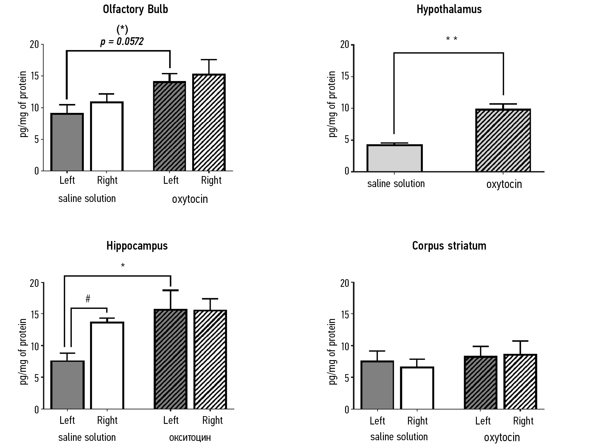 Fig. 2. Changes in oxytocin levels in different brain regions after intranasal administration of oxytocin. “Left”, left side of the brain (dark bars); “Right”, right side of the brain (light bars). The hypothalamus (sampled bilaterally) is represented by light gray bars. Groups: “Saline”, control mice receiving saline (solid bars); “Oxytocin”, experimental mice receiving oxytocin (hatched bars). Bar heights represent mean values, with error bars indicating standard error (M ± SEM). Differences between groups: (*) р = 0.0572 — a trend toward increased oxytocin levels in the left olfactory bulb; * — р < 0.05; ** — р < 0.01; differences between oxytocin levels in the left and right hippocampus: # — р < 0.05 (Student’s t-test)